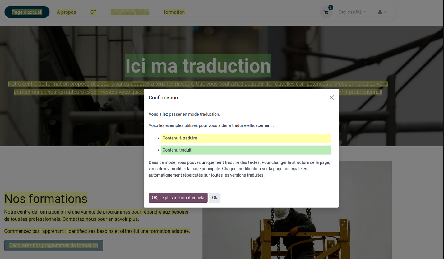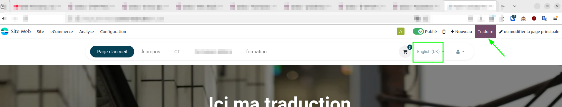 - Travail manuel : La traduction des pages nécessite un travail spécifique et n’est pas générée automatiquement par Odoo.